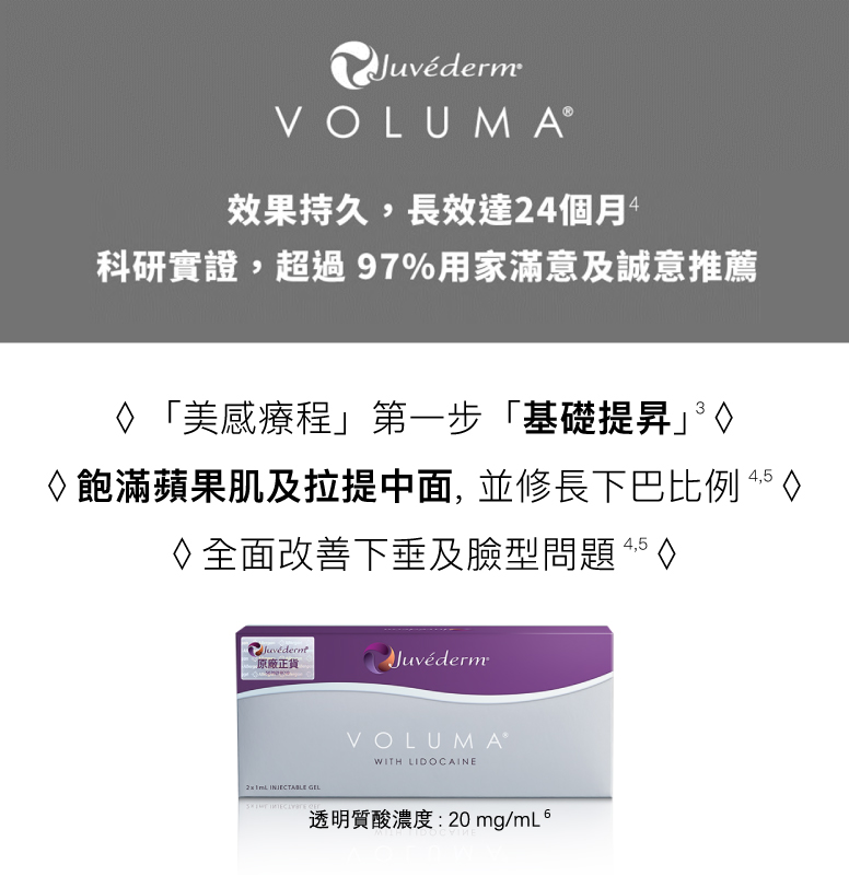 4. VOLUX™, VOLUMA®, VOLIFT®, VOLBELLA® 及 VOLITE ™ 均獲得歐盟 CE 認證. European Commission, Juvéderm hyaluronic acid based medical devices. EC certificate number: 3824296CE02; 3824296CE05; 3824296CE06; 3824296CE08; 3824296CE09, Mar 2020; 5. Juvéderm® VOLBELLA® with lidocaine DFU. 73363RX10. Revision 2020-07-10;