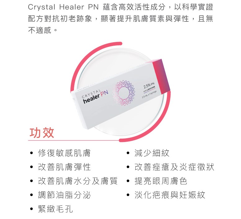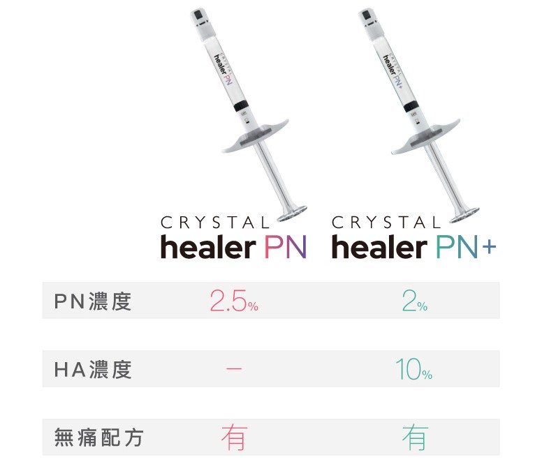 CrystalHealerPN水晶針是一種高濃度多核苷酸注射劑,能有效修復面部及身體嬌嫩部位,煥活肌膚細胞,改善膚質。透明質酸補濕針則通過鎖水進行保濕,效果短暫。