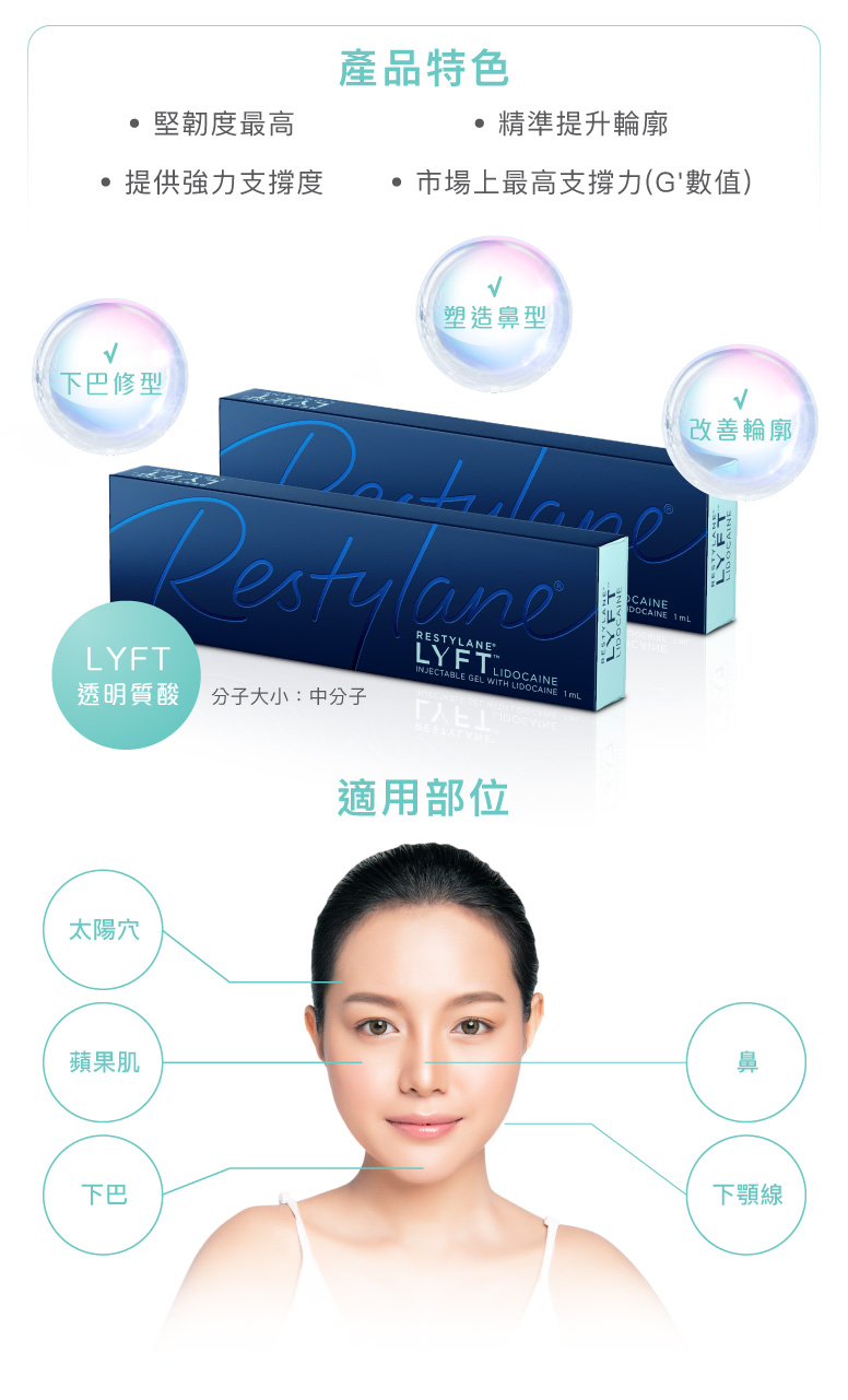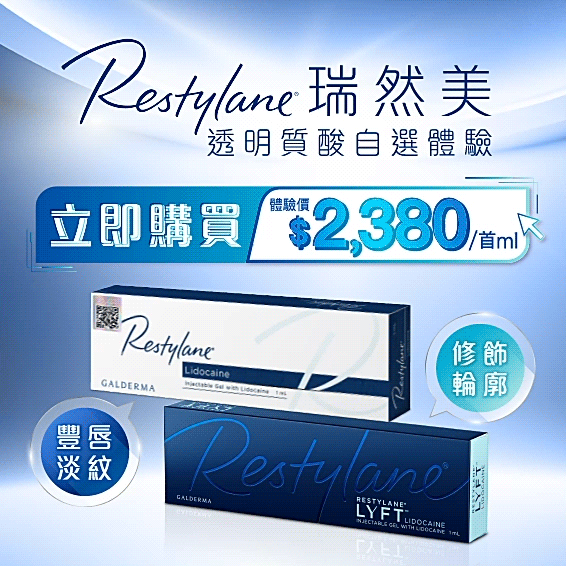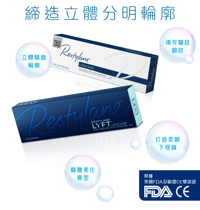 Restylane填充系列®透明質酸帶有堅挺凝膠結構,能顯著提升輪廓,維持持久穩定的效果,更獲美國FDA及歐盟CE雙認證,品牌深受用家信賴。