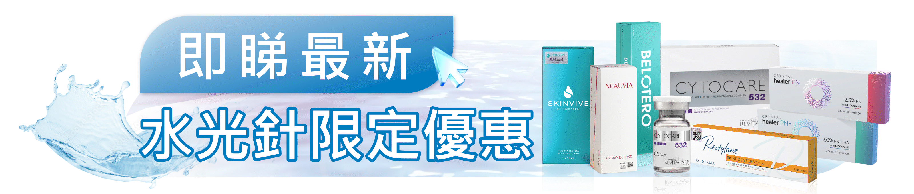 水光針的原理是利用極細微針頭,將透明質酸(Hyaluronic Acid)及其他活性成分直接注射入大約皮下2mm的真皮層的醫學美容療程。透明質酸是人體天然存在的保濕因子,能承載自身重量千倍水分,為皮膚提供深層保濕與彈性支撐,刺激膠原蛋白生成,達至改善乾燥、細紋、暗沉等修護效果。